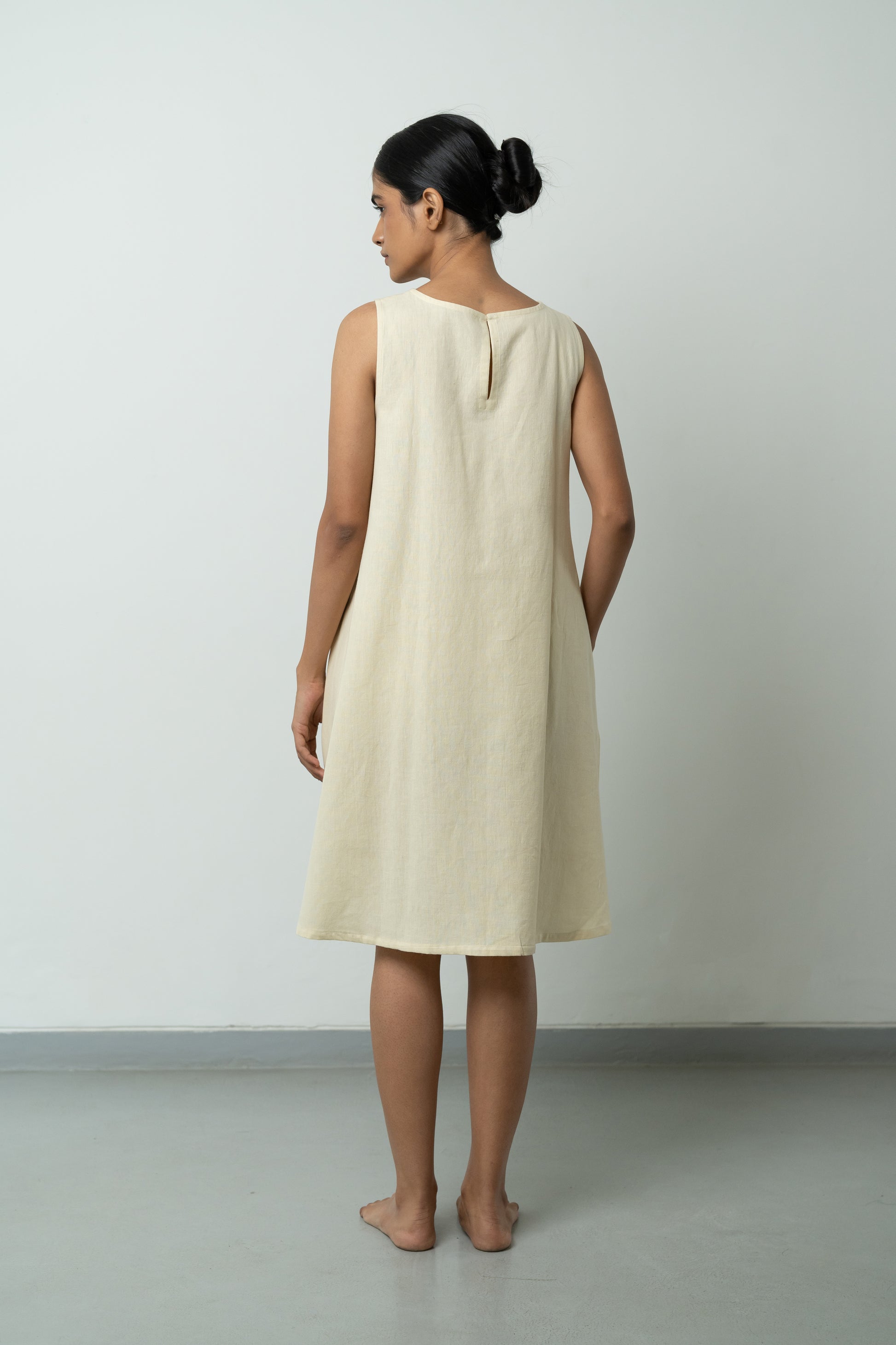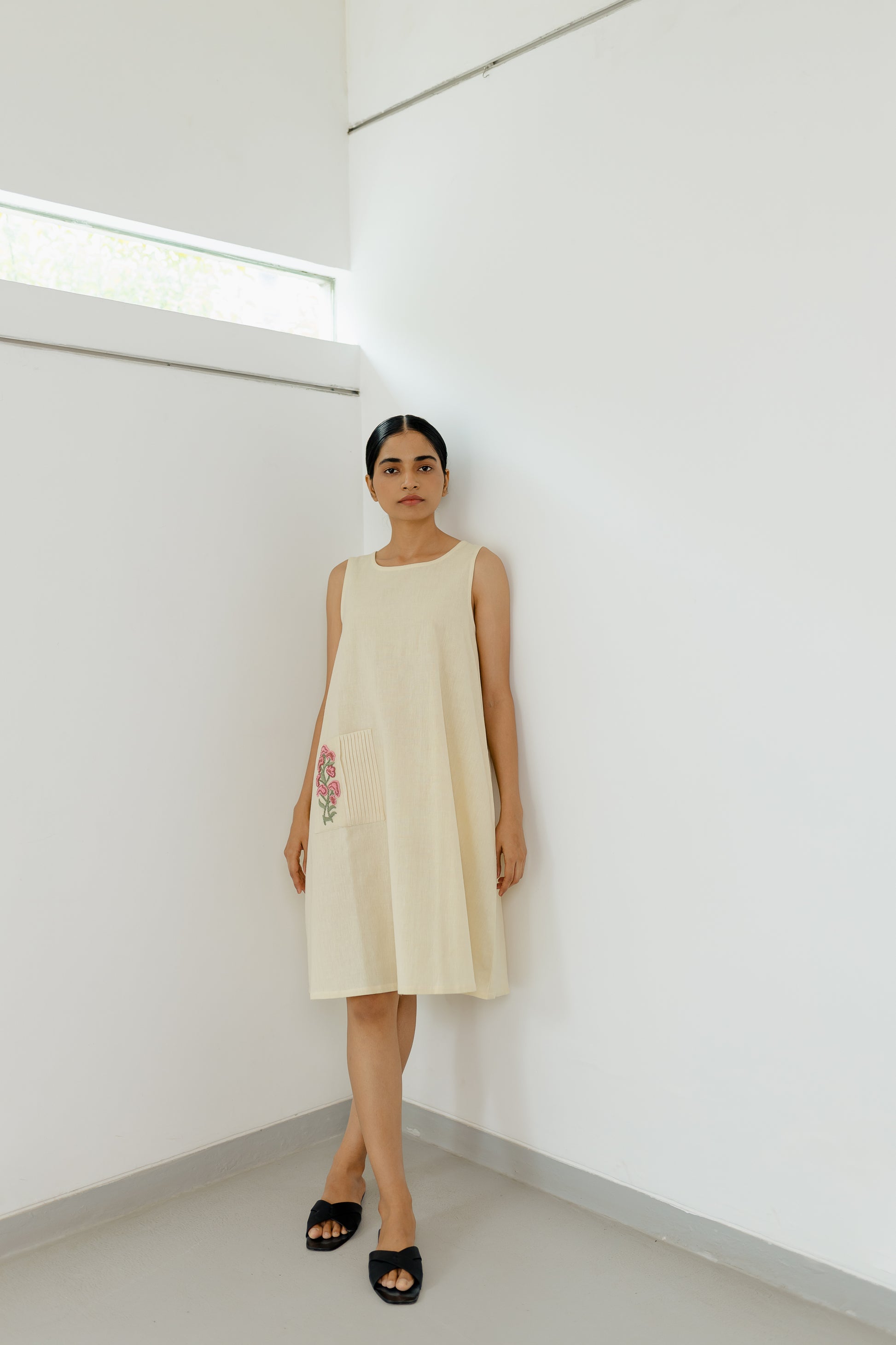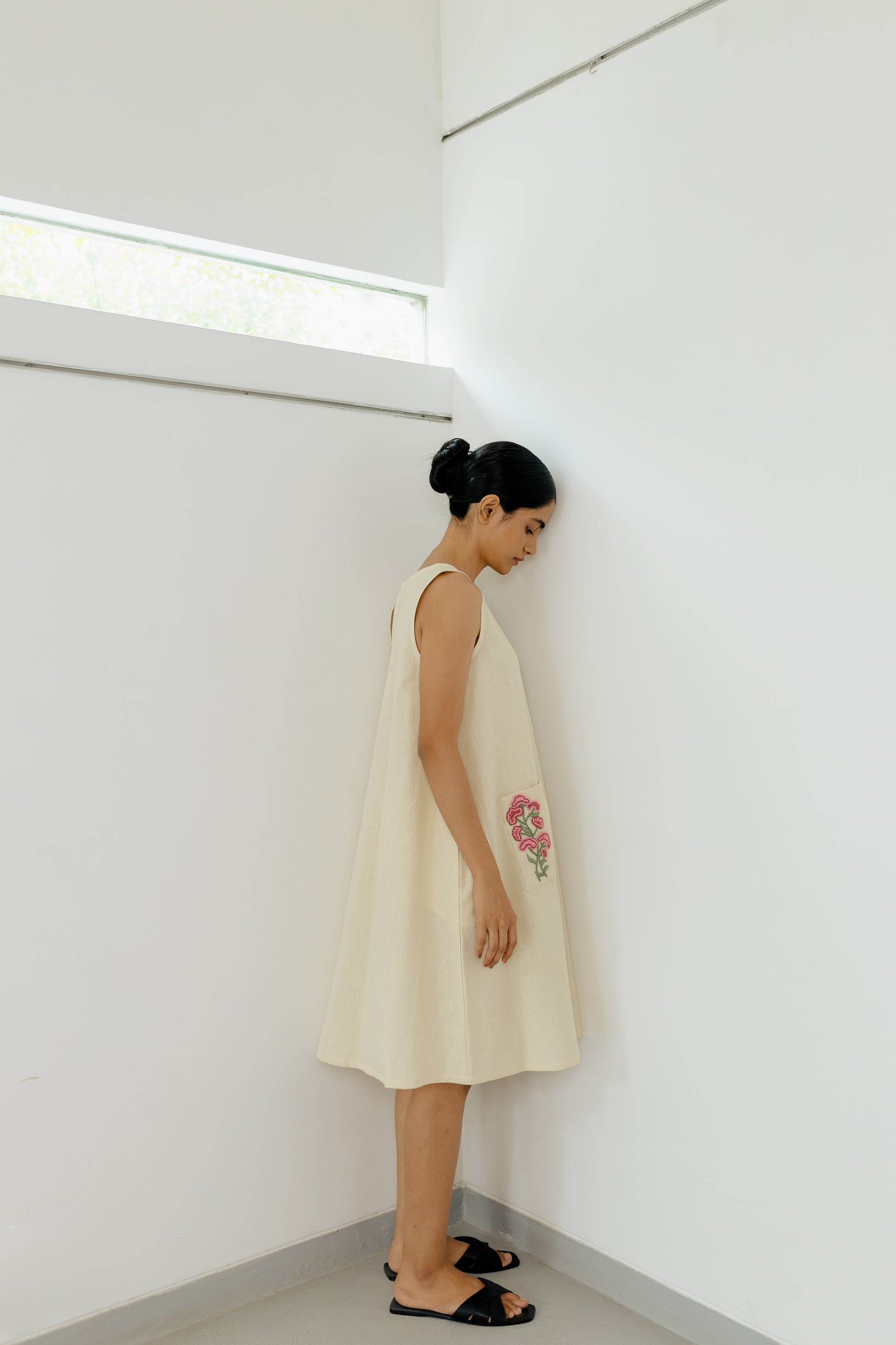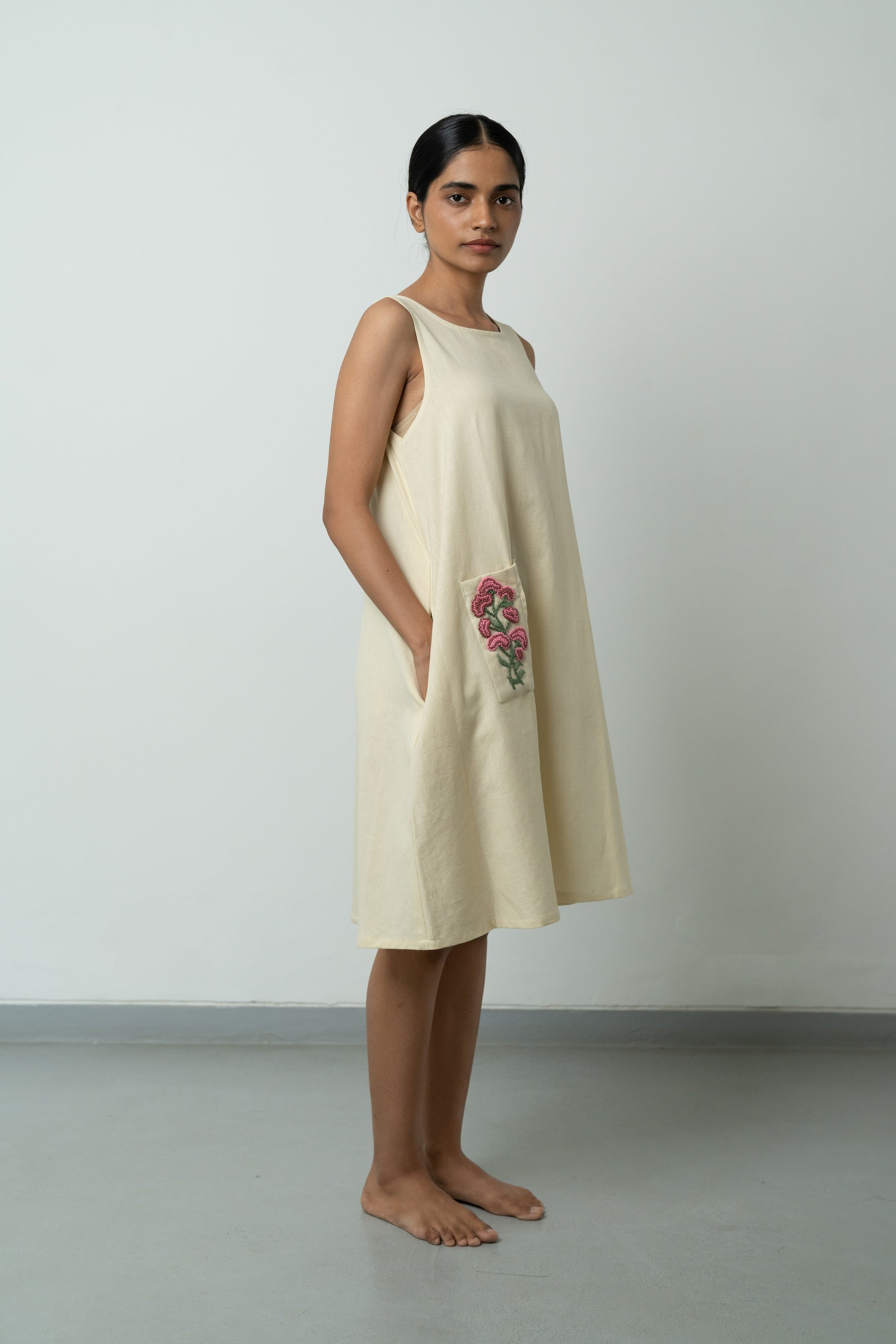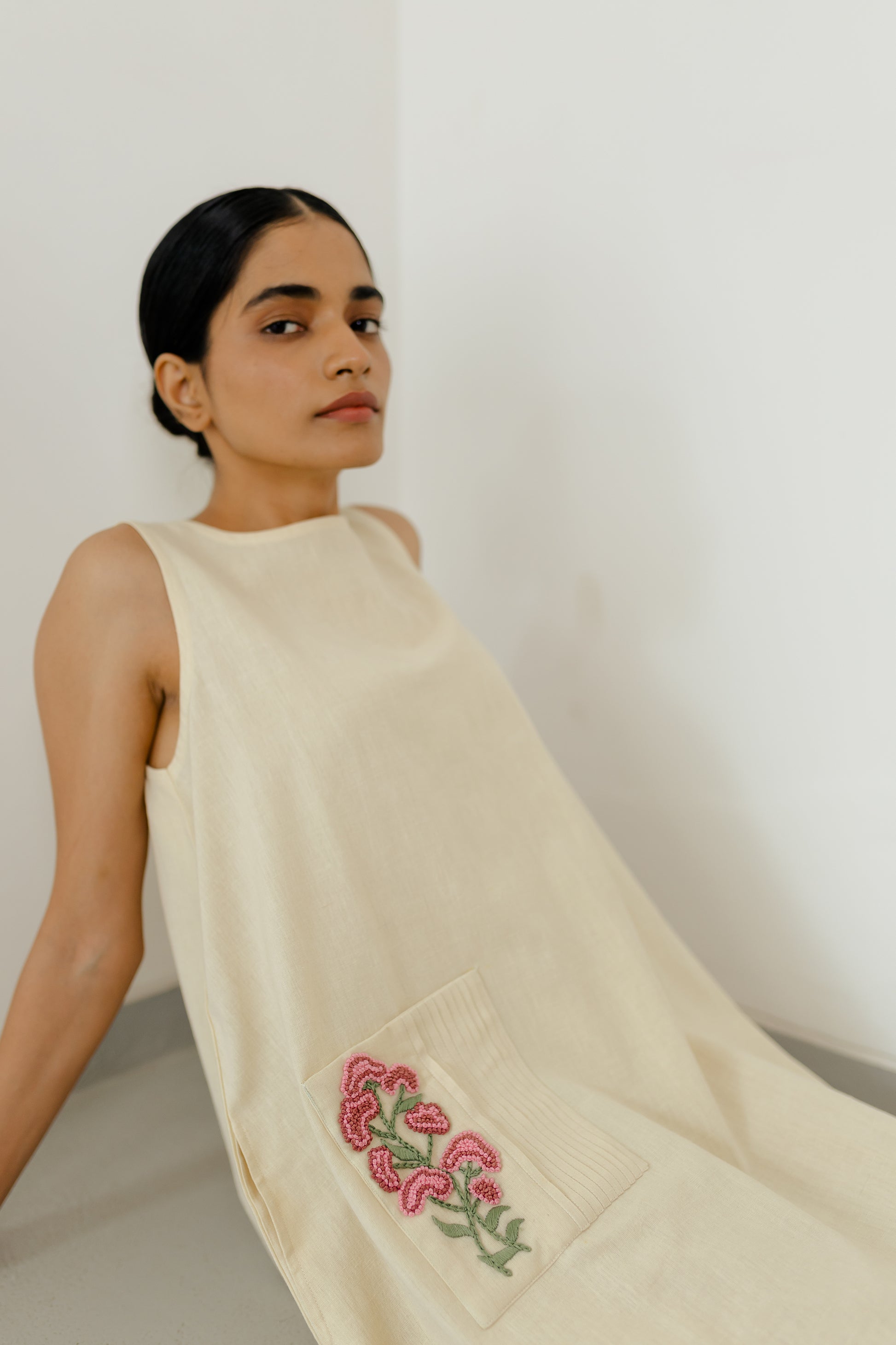 Beige A-line dress with pleated, hand-embroidered pink front pocket, in-seam pockets, sleeveless, roundish neckline, and comfortable fit.