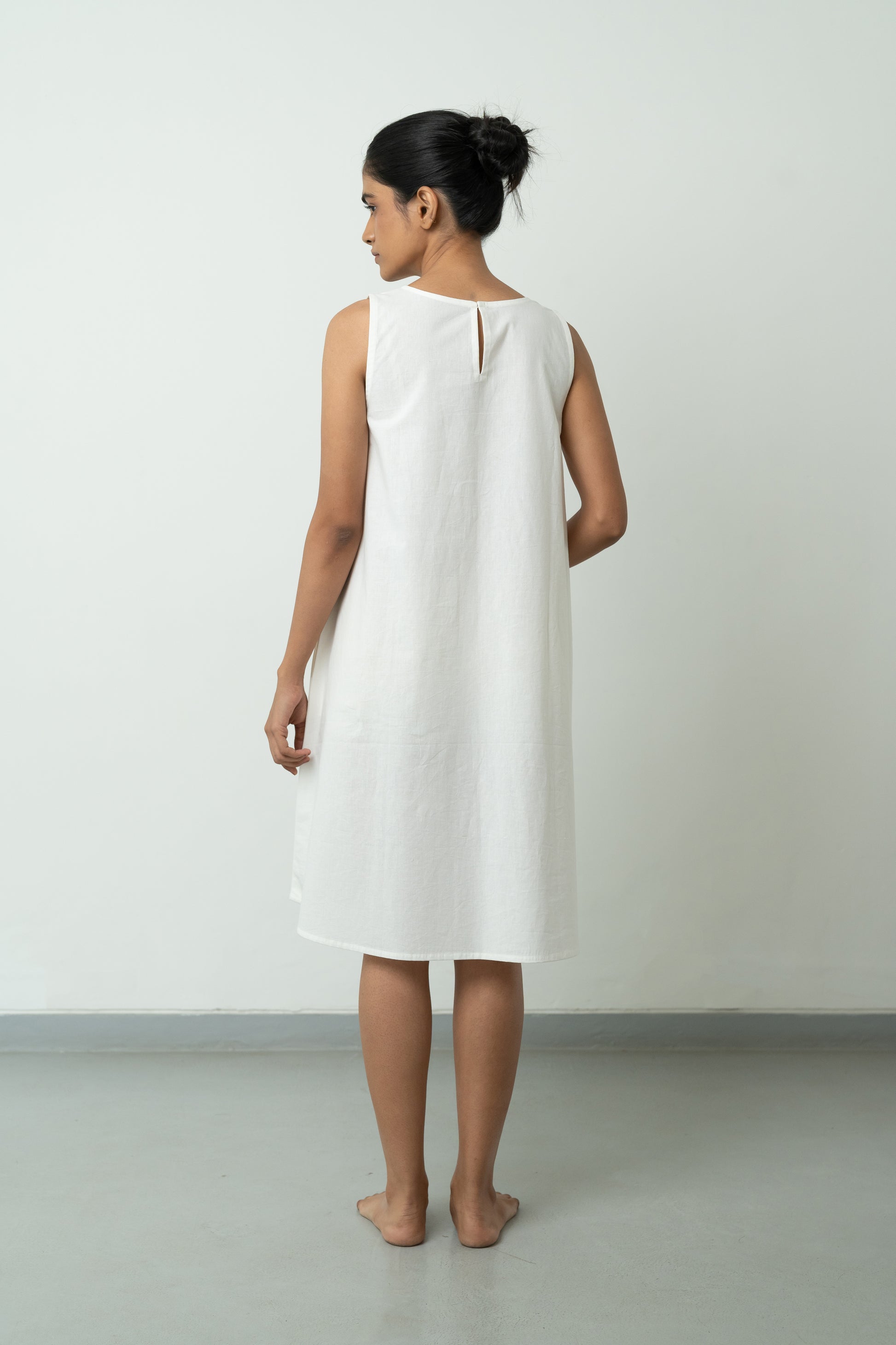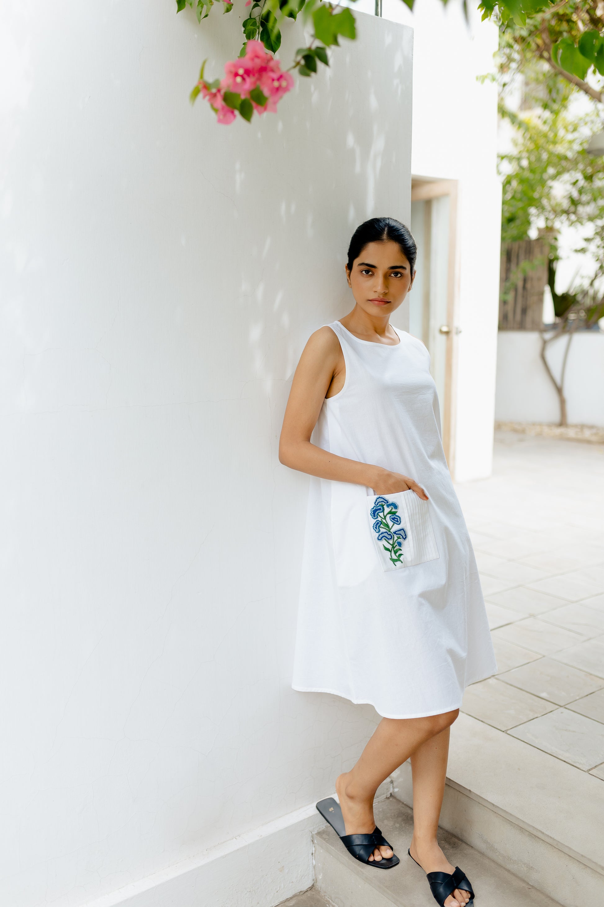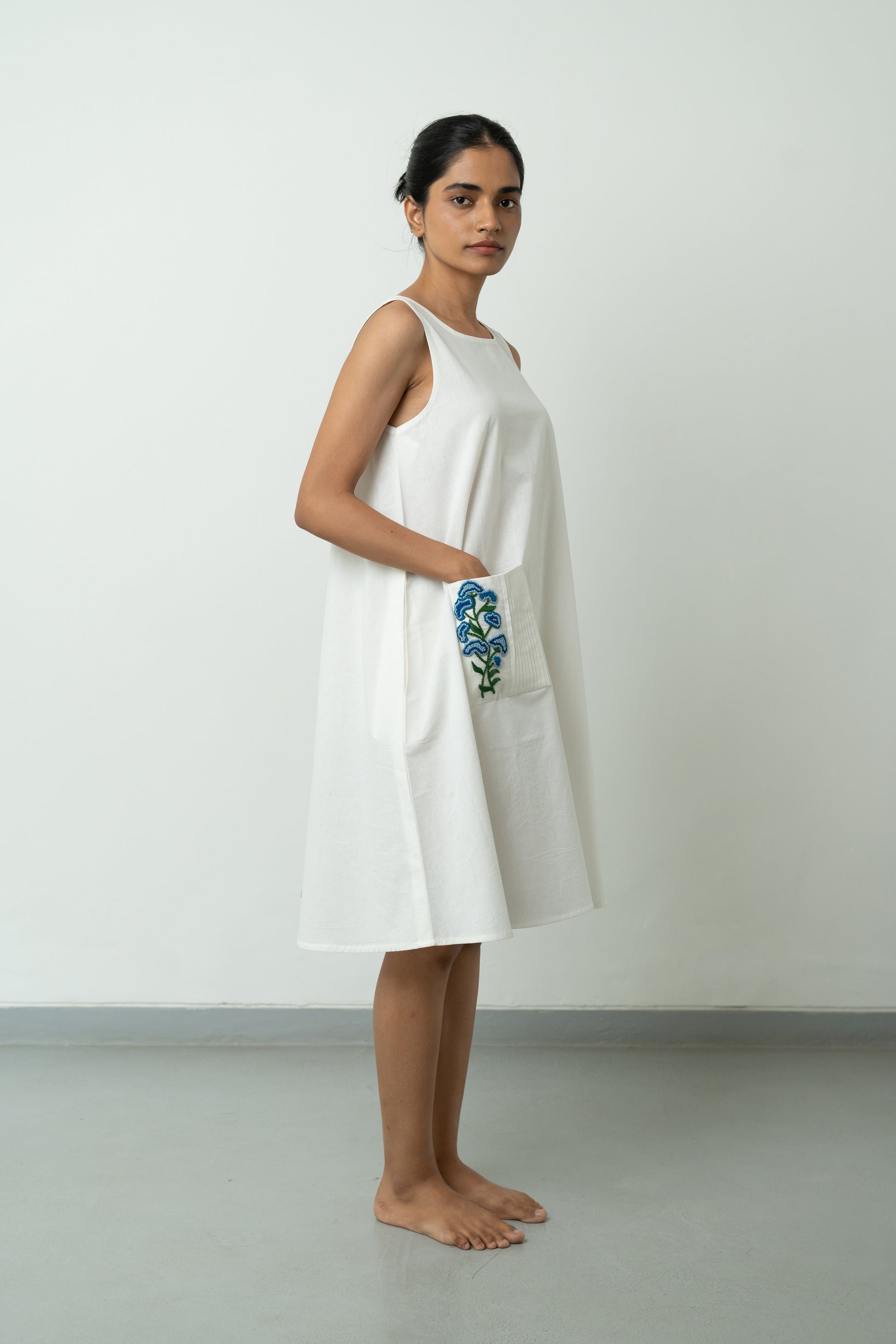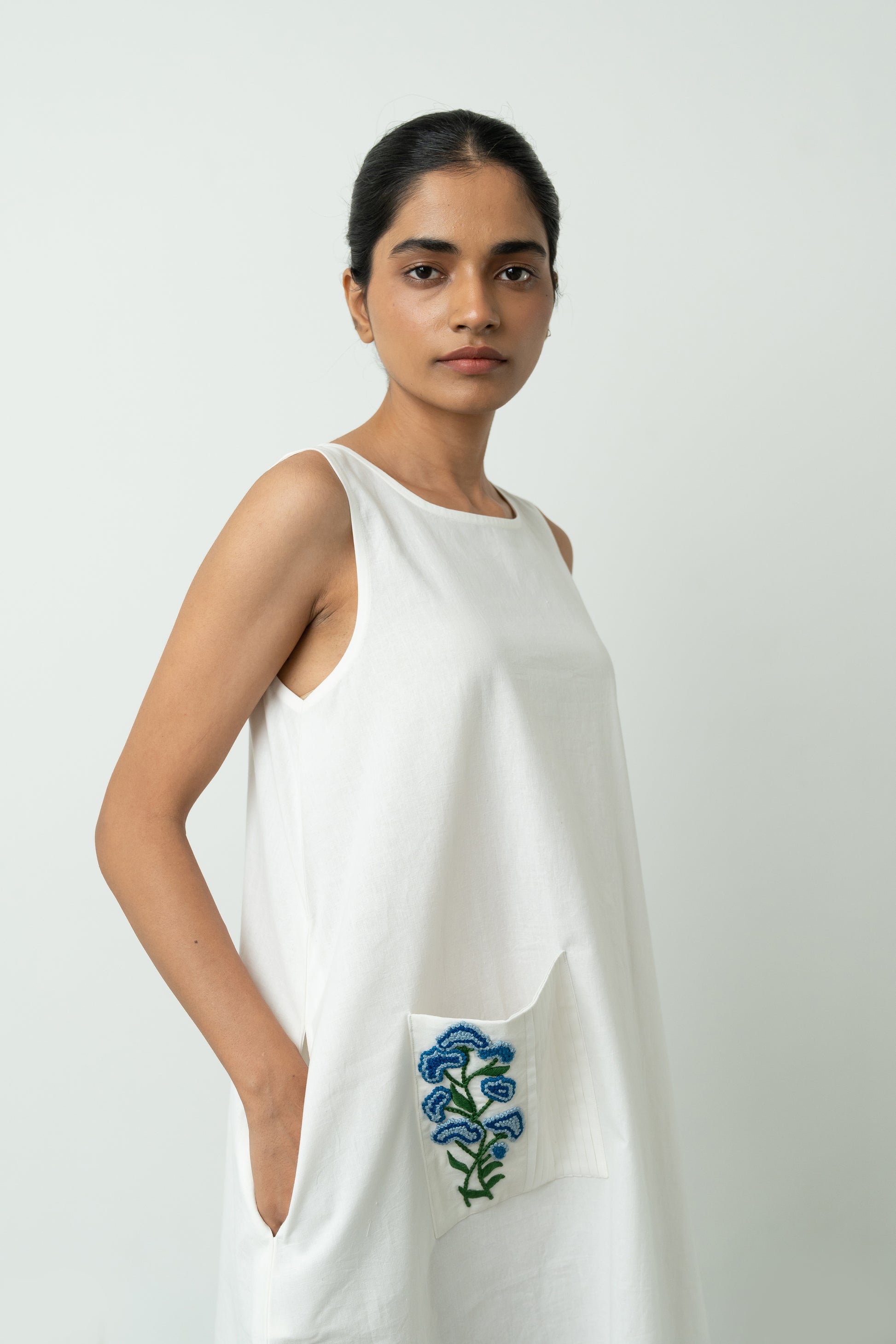 White A-line dress with pleated, hand-embroidered blue front pocket, in-seam pockets, sleeveless, roundish neckline, and comfort fit.