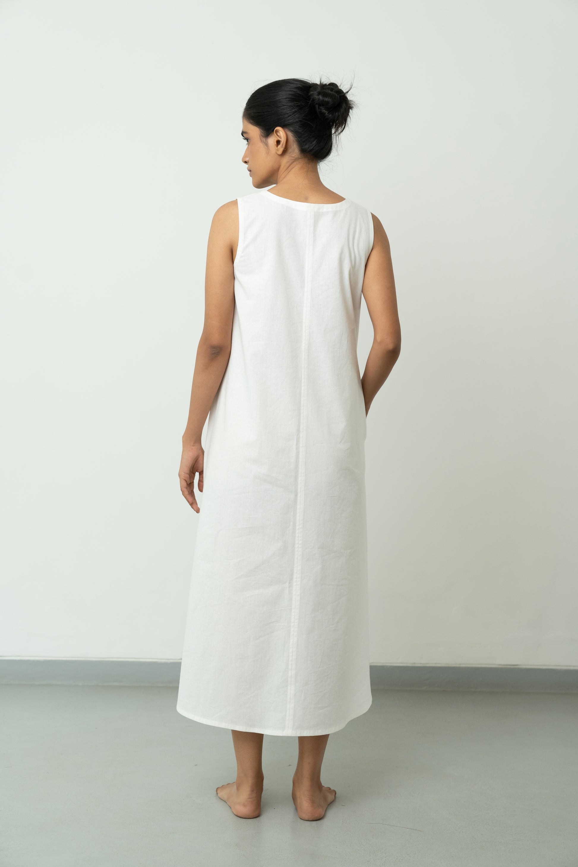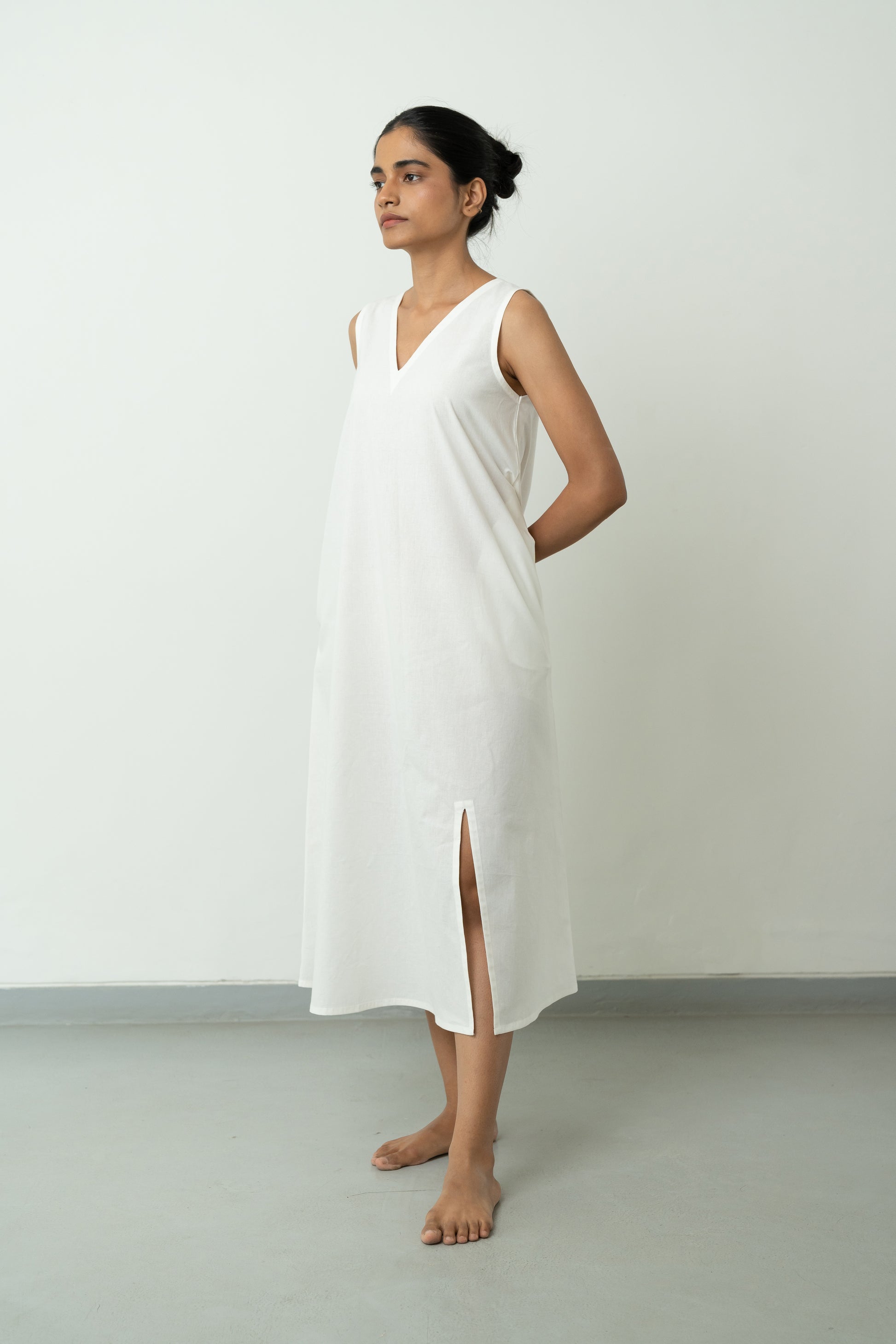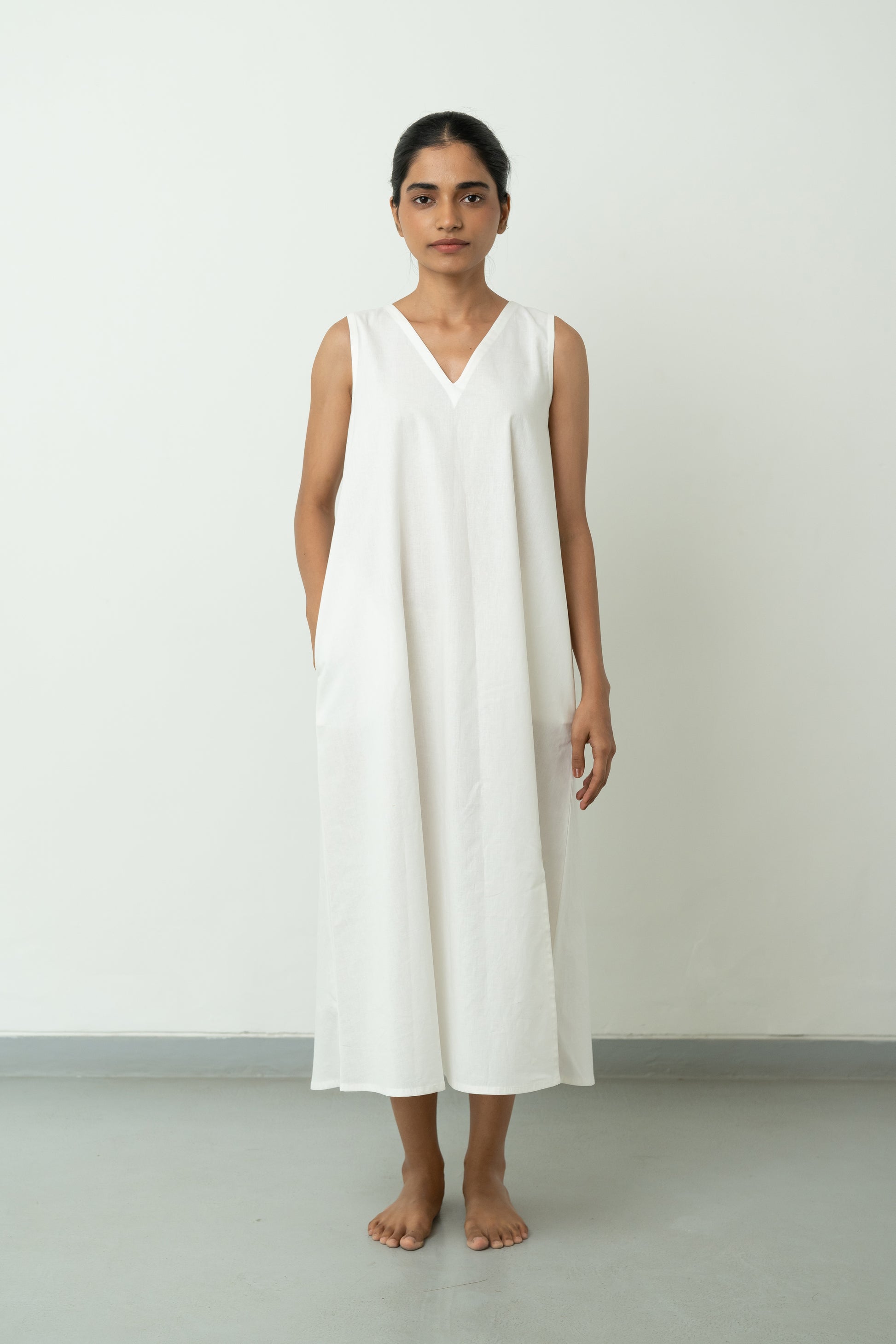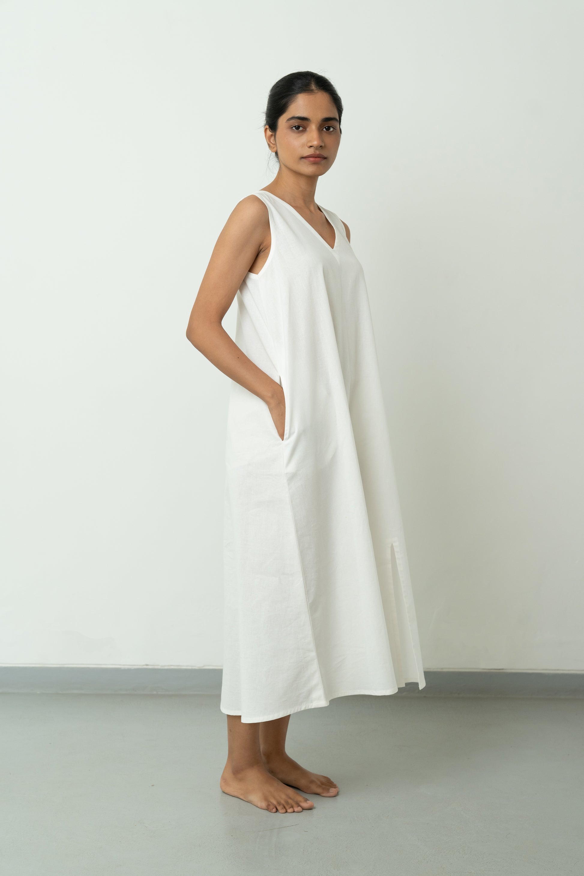 White A-line dress with in-seam pockets, sleeveless, V-neckline, calf-length, and comfortable fit. Includes a single side slit at the hemline.