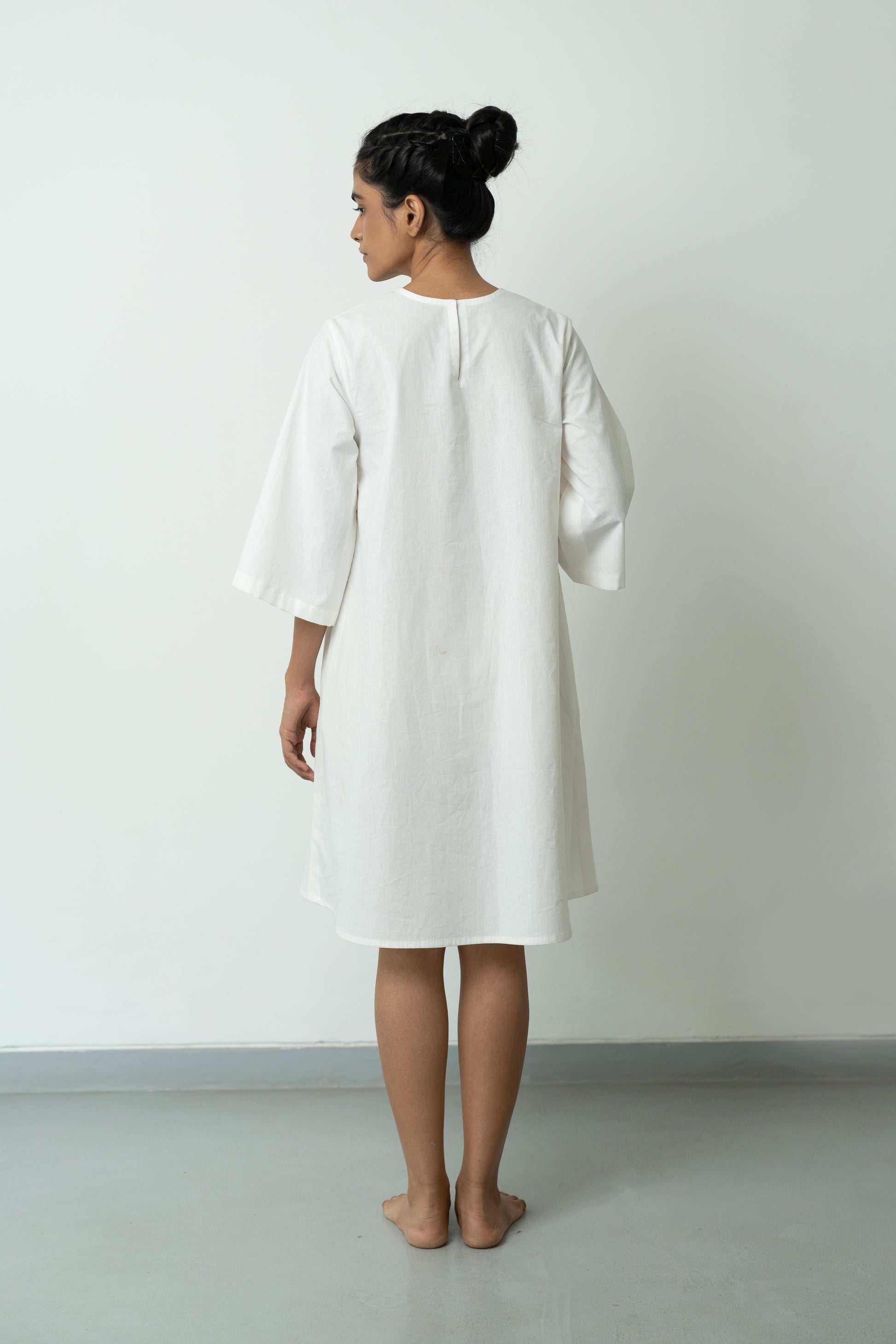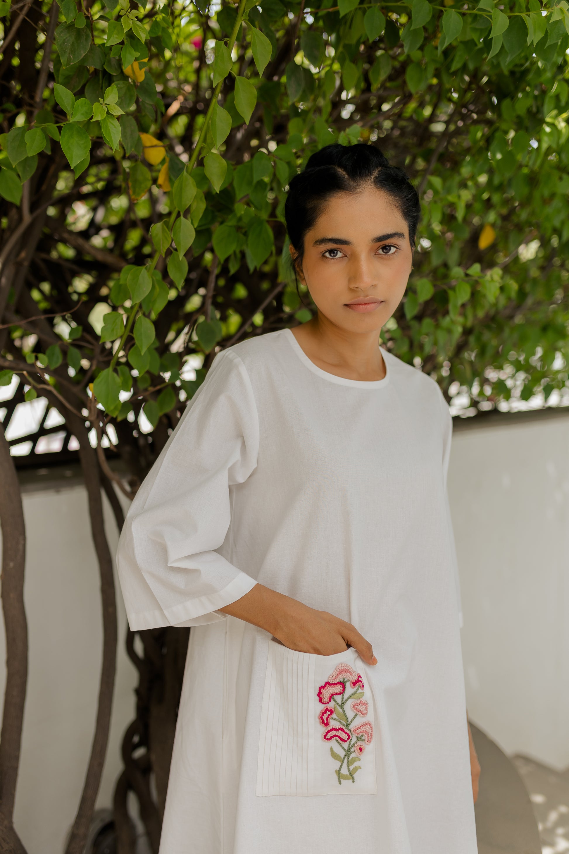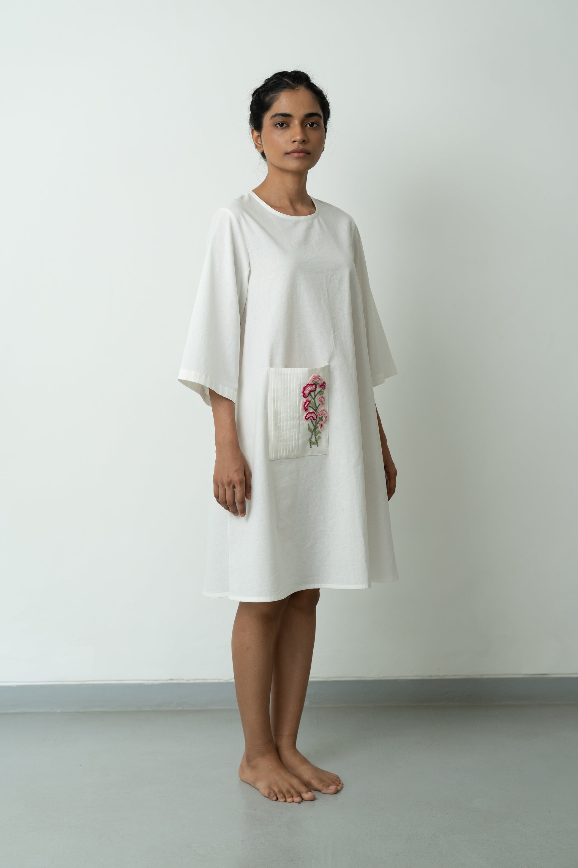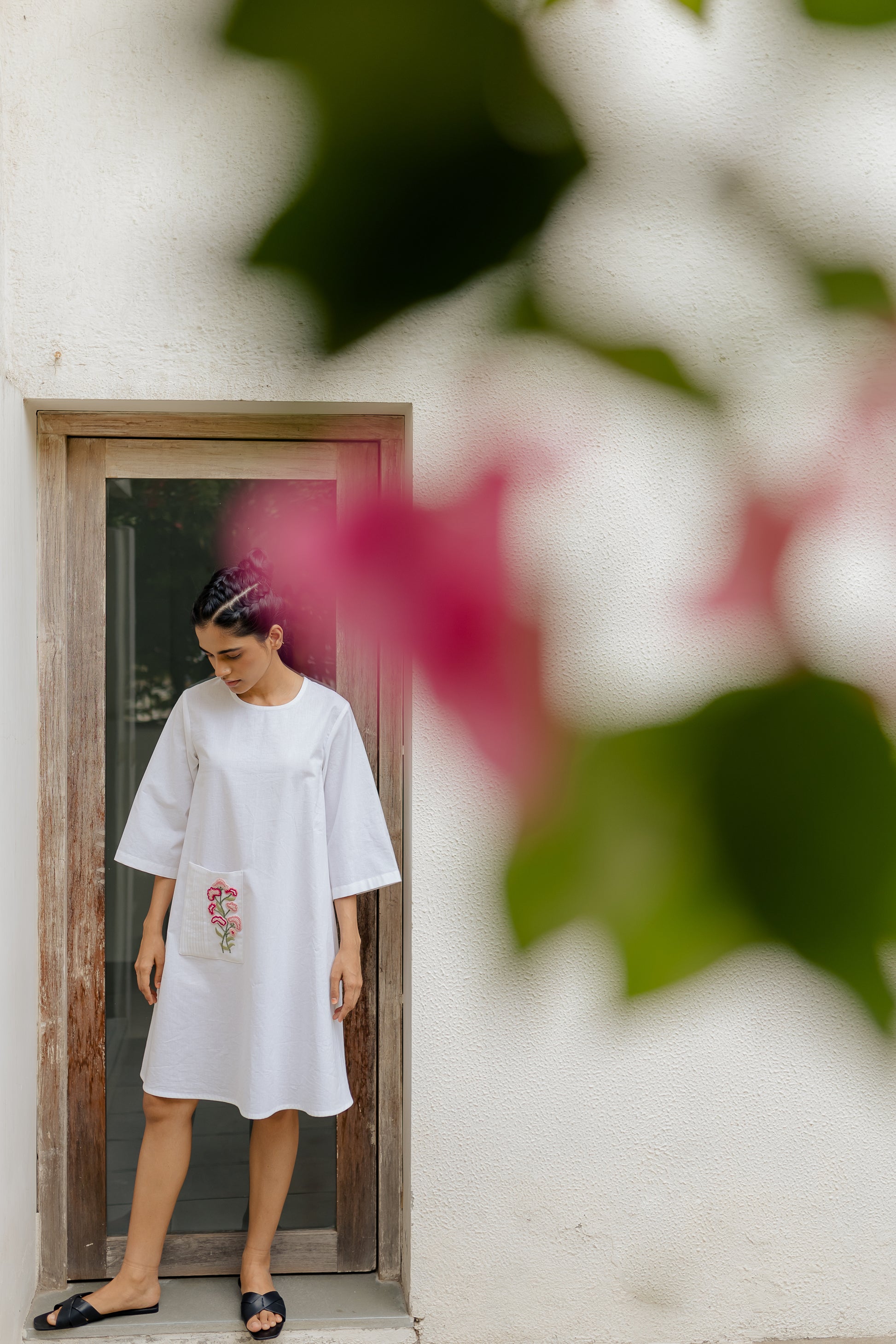 White A-line dress with pleated, hand-embroidered pink front pocket, in-seam pockets, loose sleeves, roundish neckline, and comfortable fit.