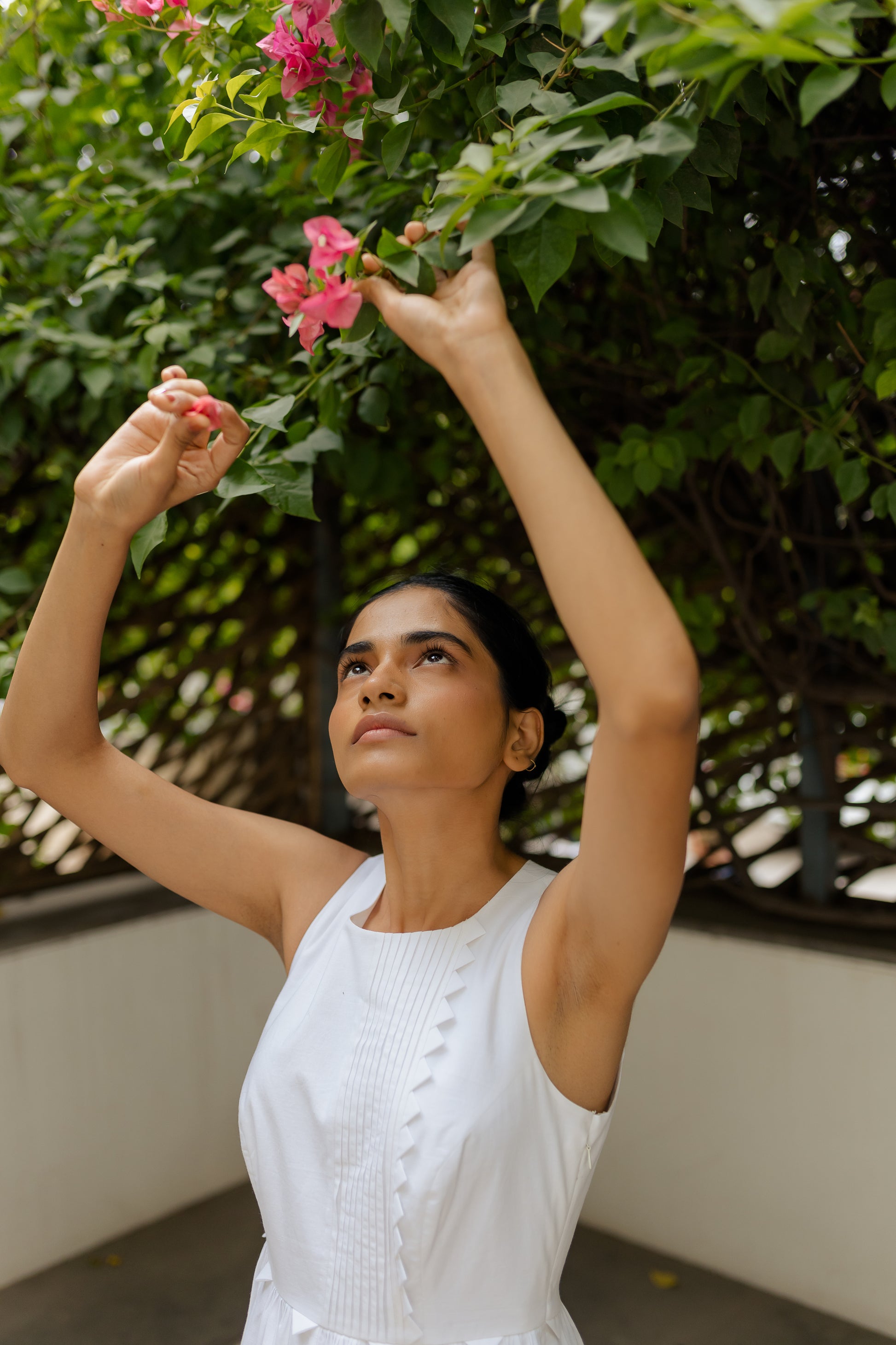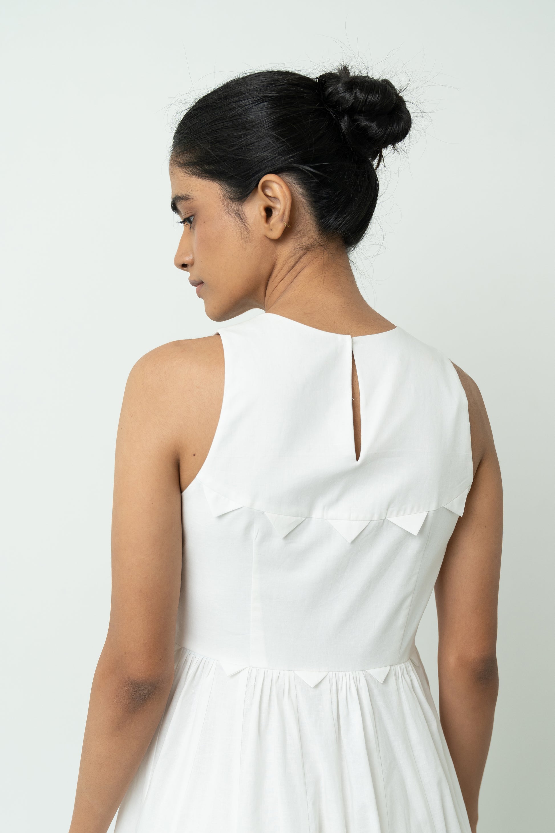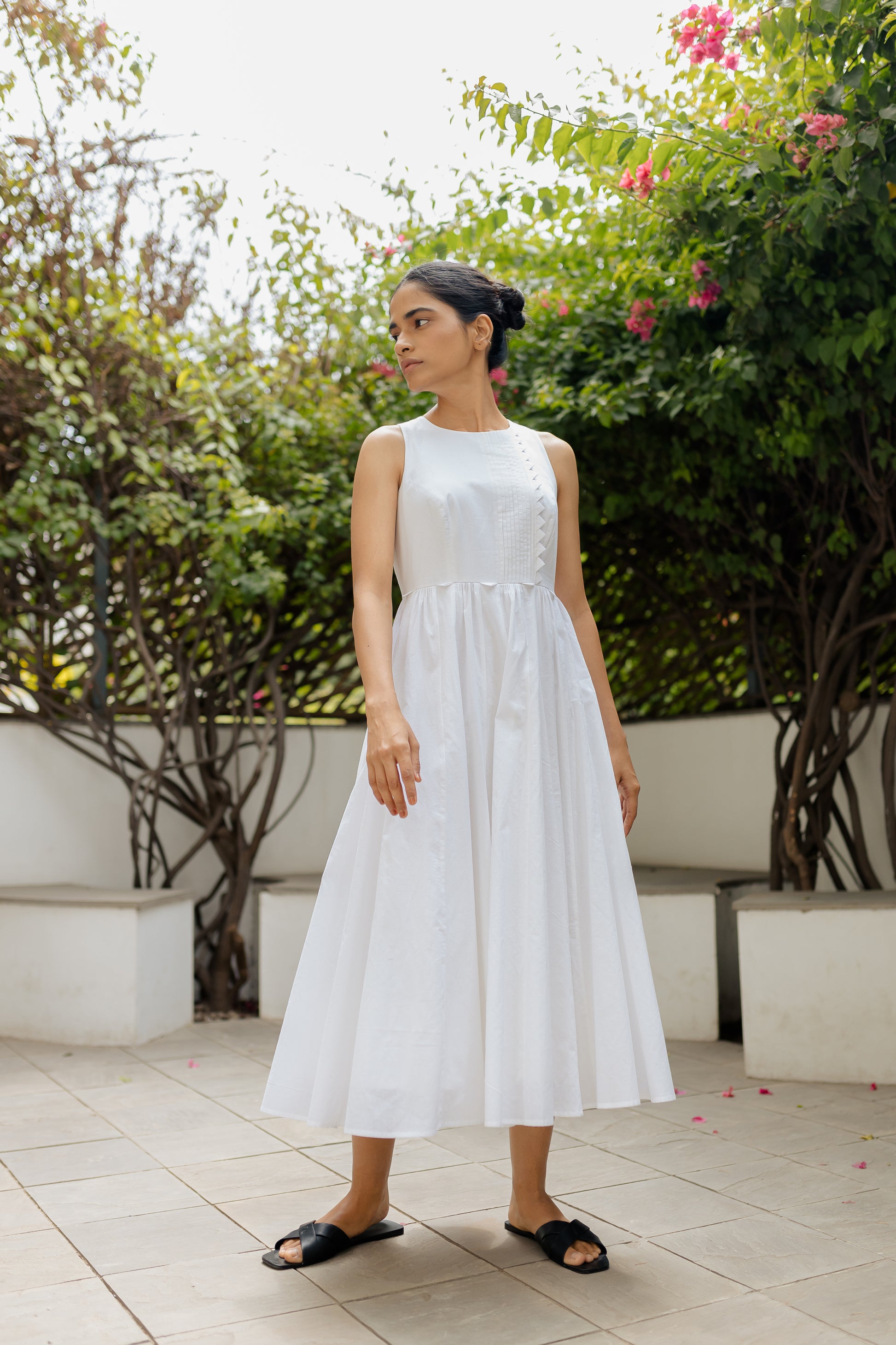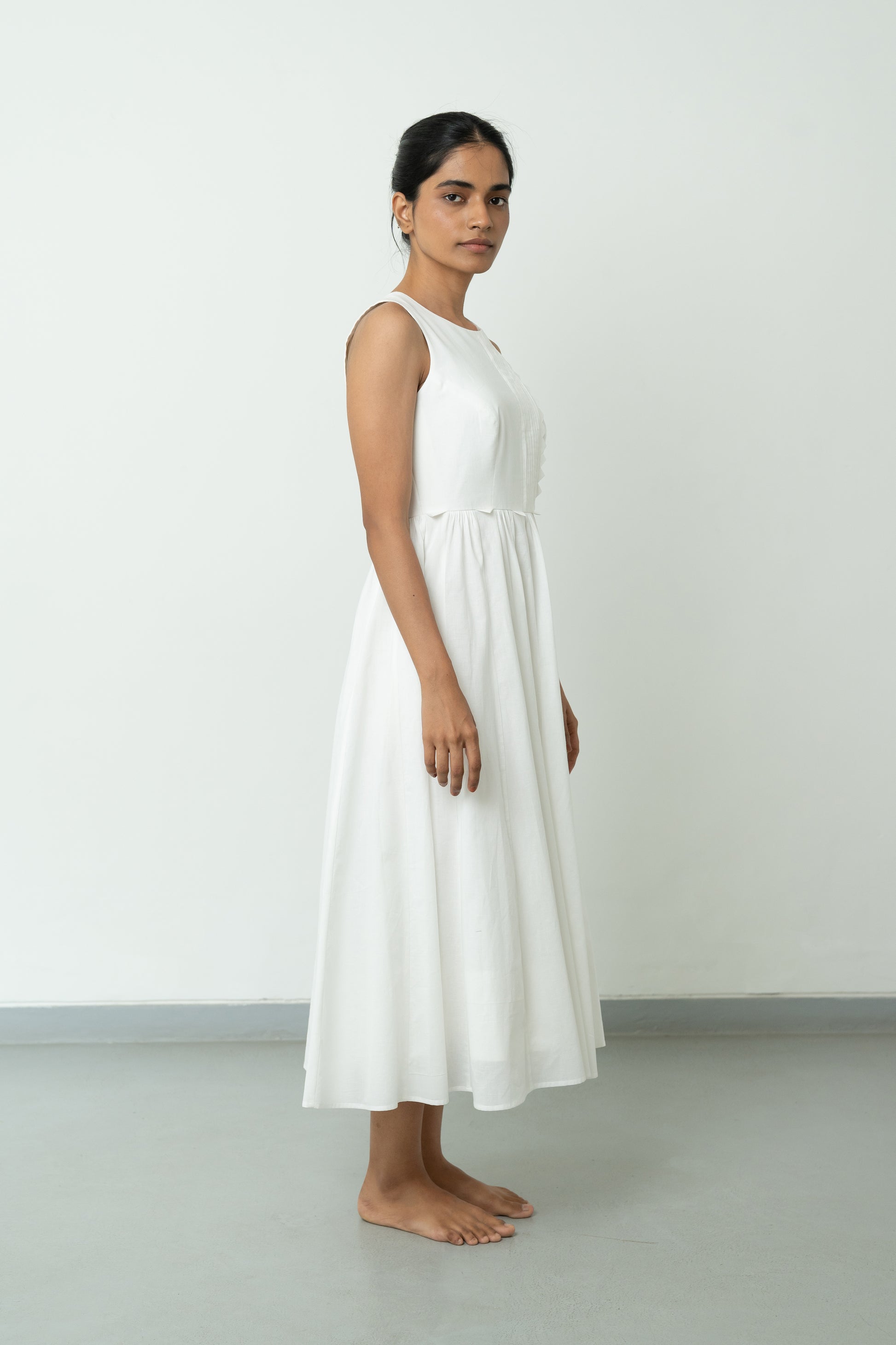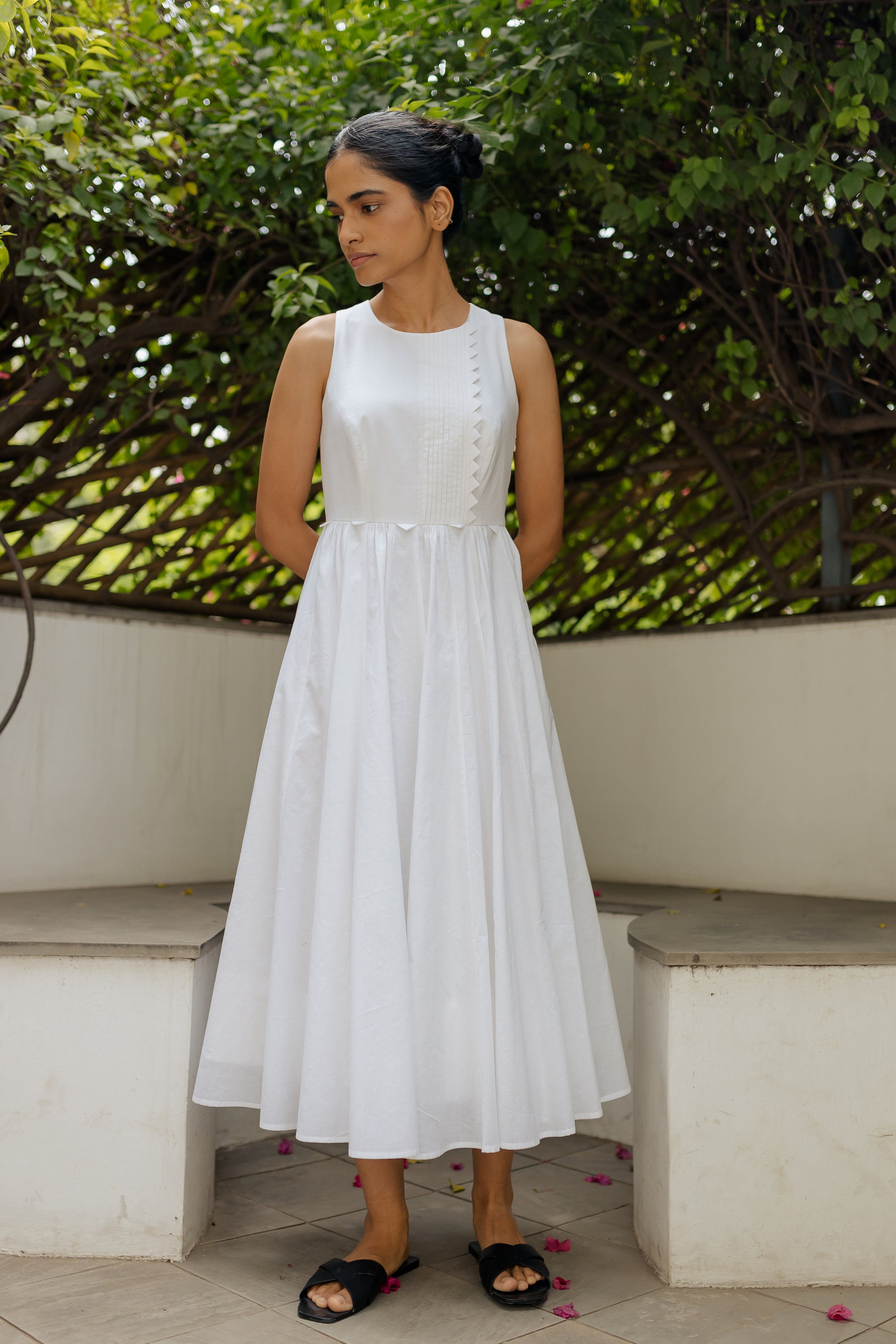 White Panelled dress with pleated bodice, in-seam pockets, sleeveless, roundish neckline, calf-length, and regular fit. A side-concealed zip opening and a single hook opening at the back.